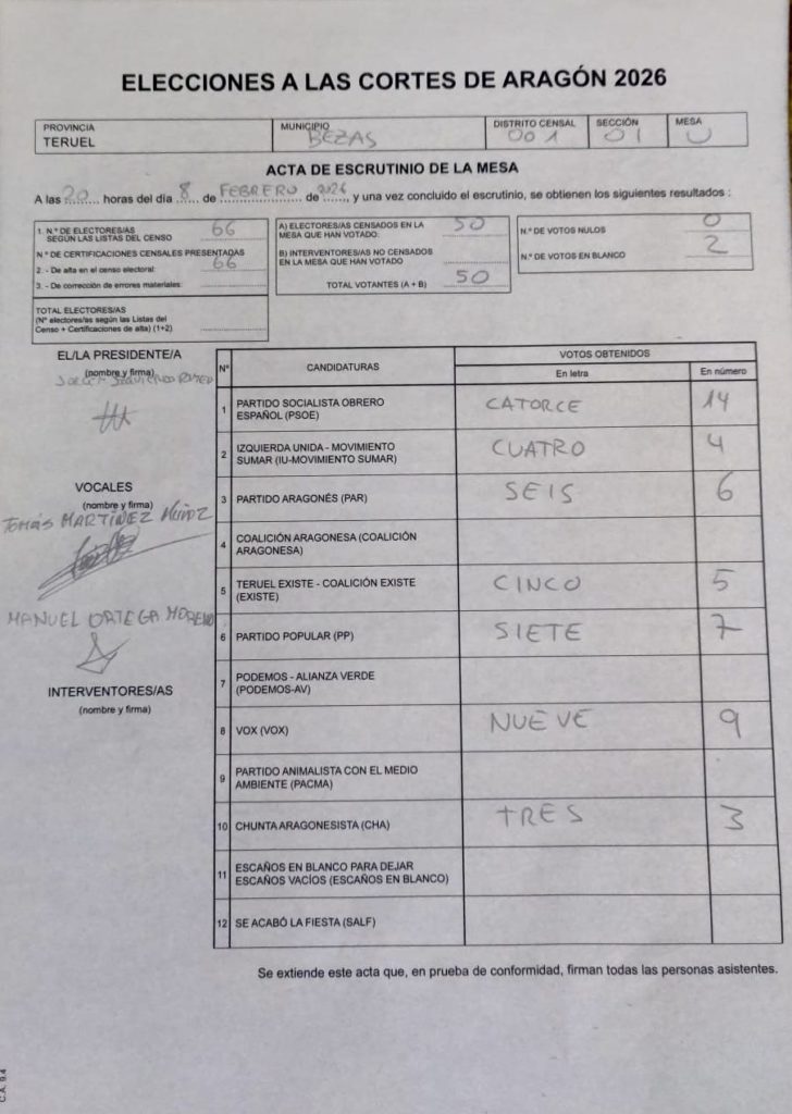 Elecciones a las cortes de Aragón. Resultados en Bezas